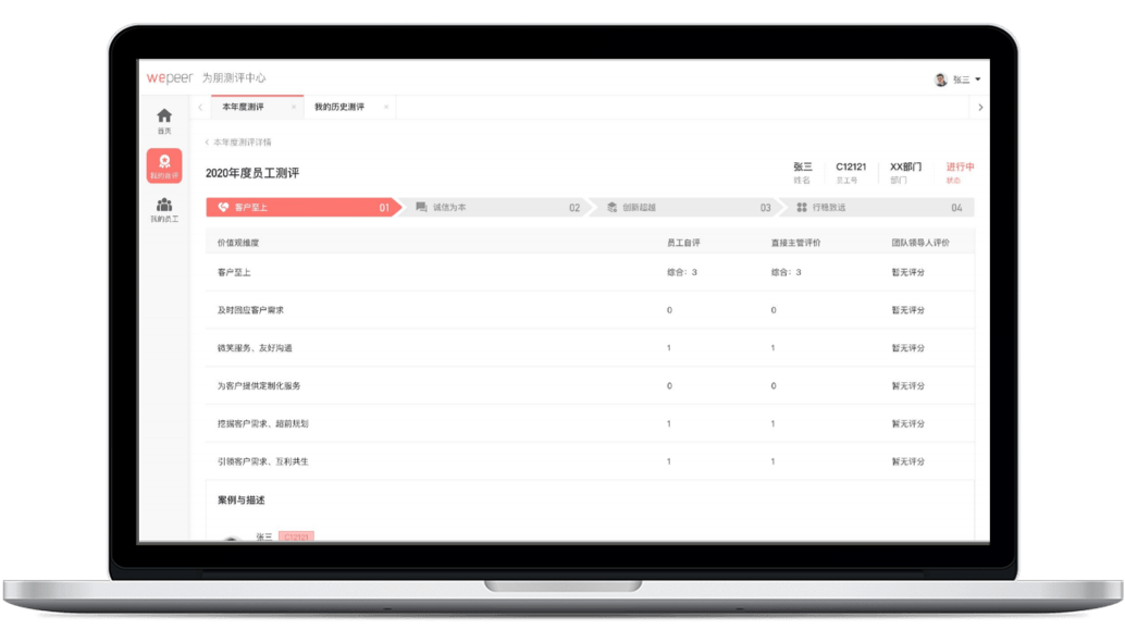 Wepeer 价值观评价系统是可以快速敏捷部署的在线测评服务(SaaS),企业只需将需要评价的价值观进行分级后,在线导入评价关系,系统将通过多种方式邀请测评对象和测评人在线进行测评,并可以将测评结果和行为案例导出。